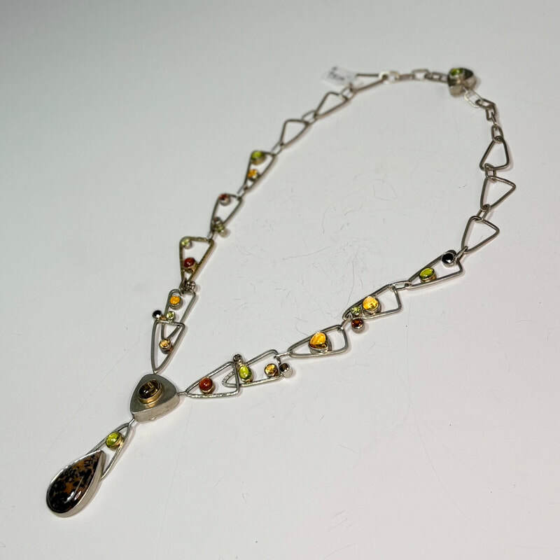 Sterling silver with Palmwood Agate, Andalusite, 18k gold link, and multi-stones. 20" chain with a 3" drop. $4,800.00